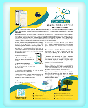 ¿Quieres conocer más acerca de CAMINANDOG? Descarga nuestro Kit de Prensa para obtener la información completa sobre nosotros, nuestra filosofía, servicio, beneficios, y más. Si quieres más información, por favor, contáctanos.